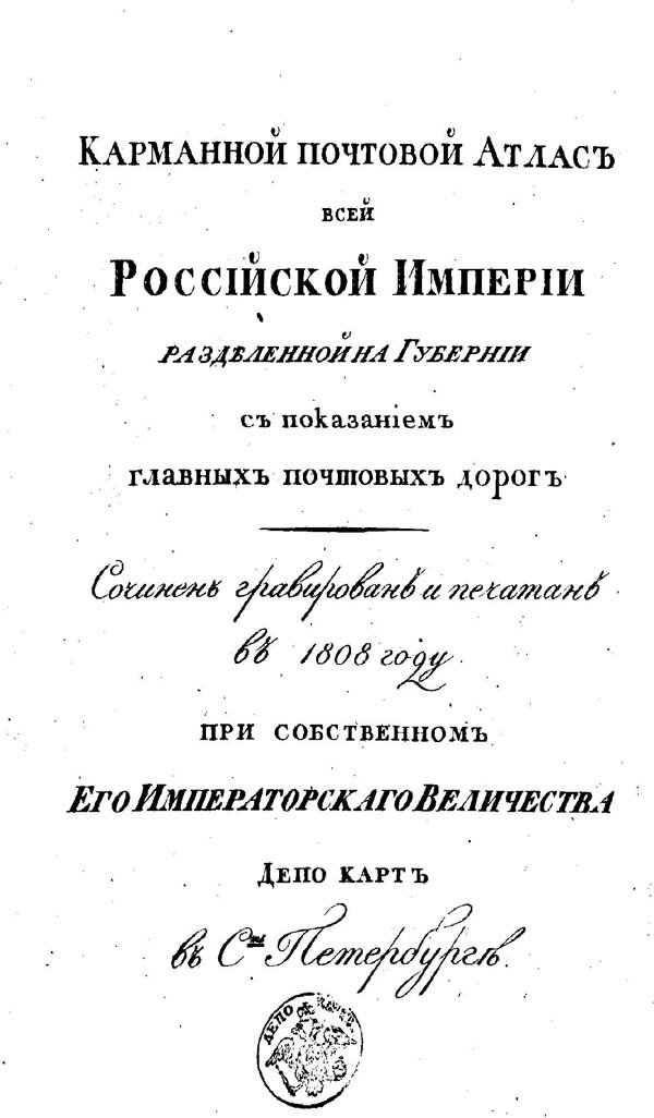 Одним из первых атласов Российской империи подготовленных Собственным его Величества Депо карт был карманный почтовый атлас , изданный в 1808 году.
