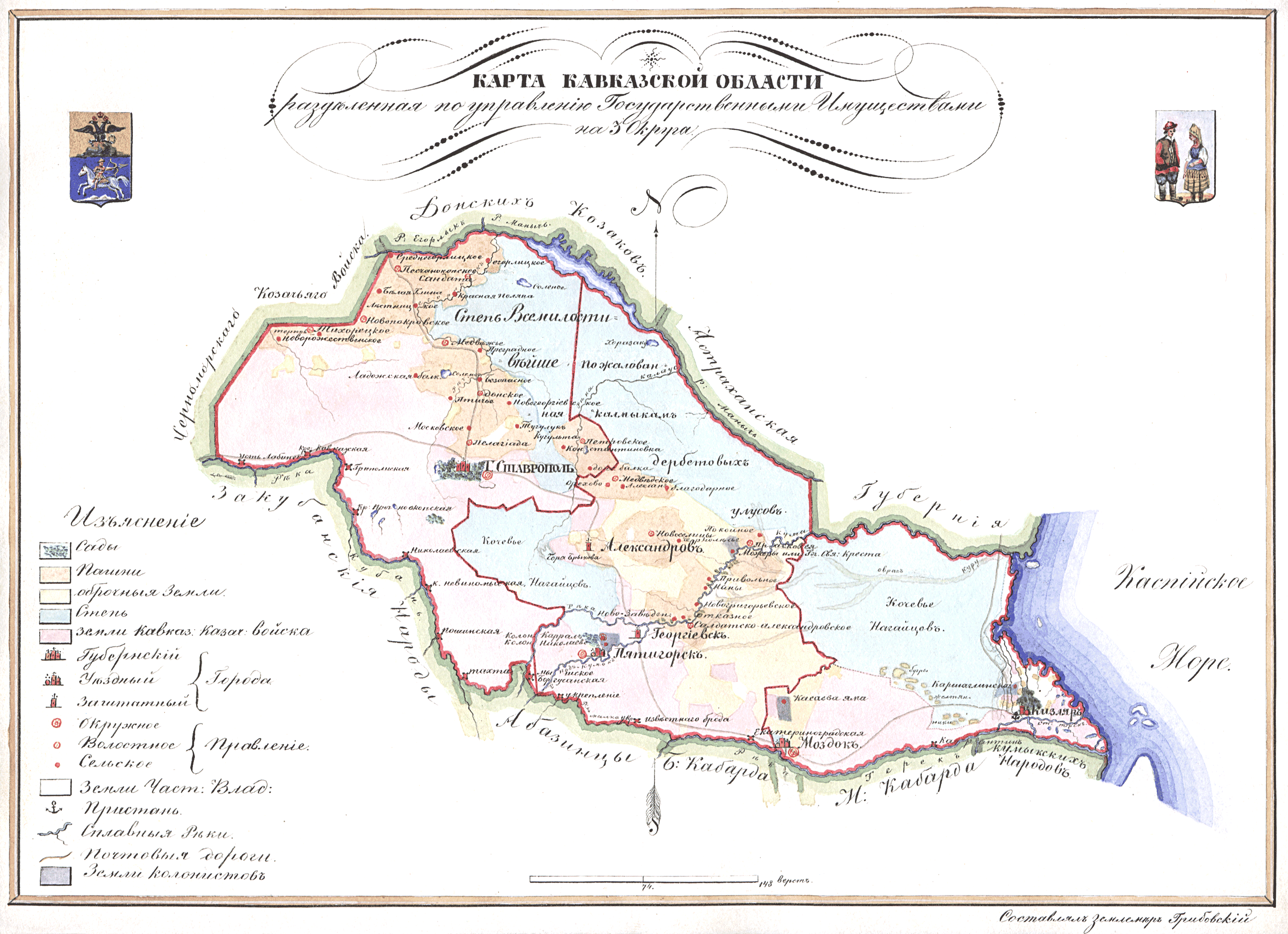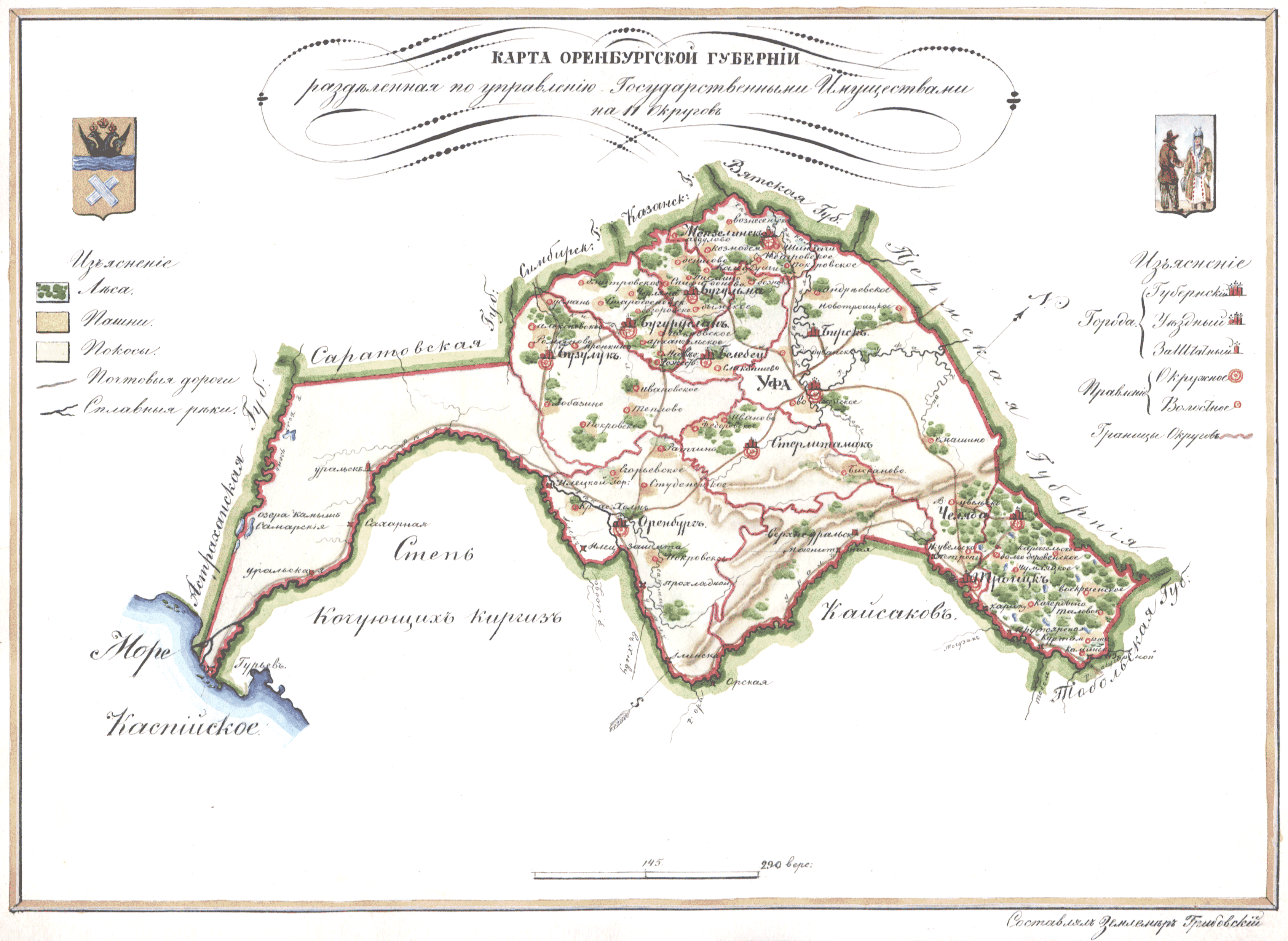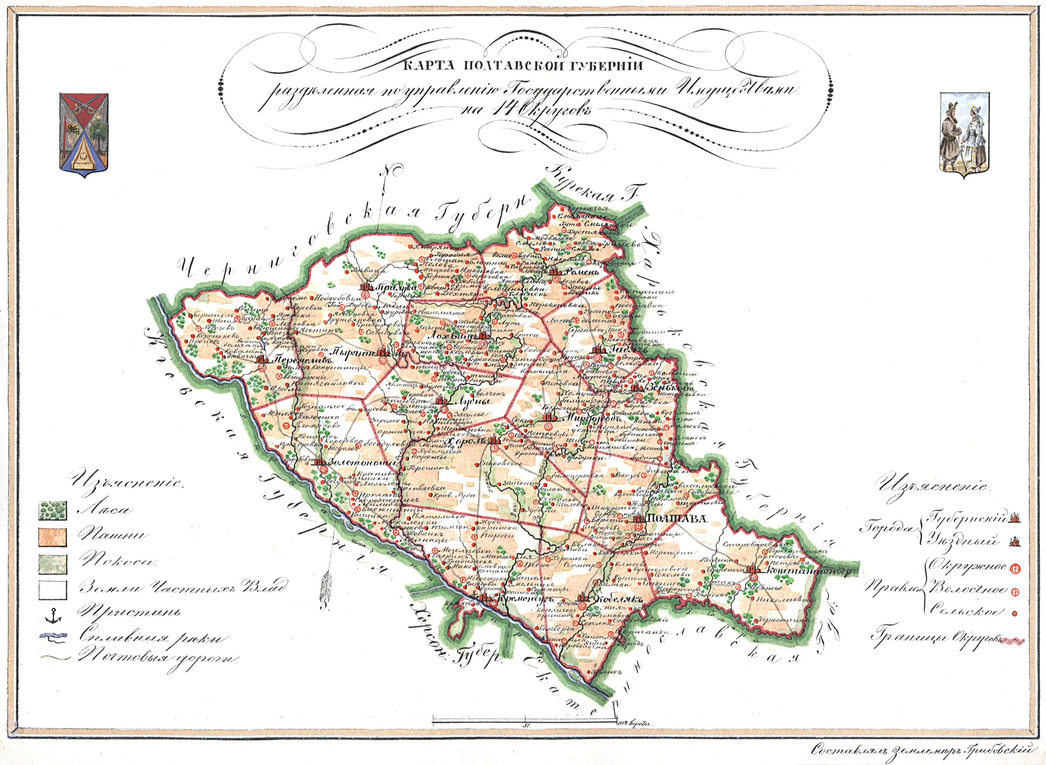 Атлас, составленный под руководством старшего землемера Грибовского и изданный в 1843 году, состоит из 33 листов. Каждый лист размером 24х32 см. На свободных частях листов атласа изображены гербы губерний и народные костюмы. Условные обозначения приведены на каждом листе карты.