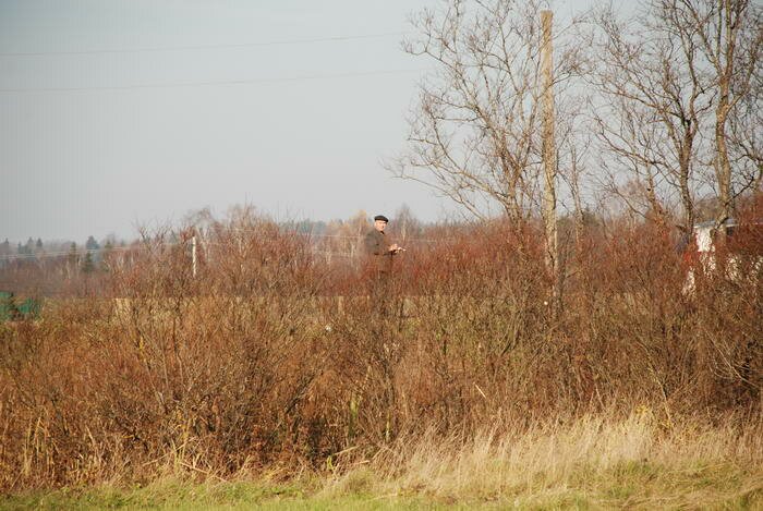 Мы останавливаемся за деревней у поля со скошенной травой. Мой знакомый вытаскивает из чехла металлоискатель и лопату, надевает сапоги.
