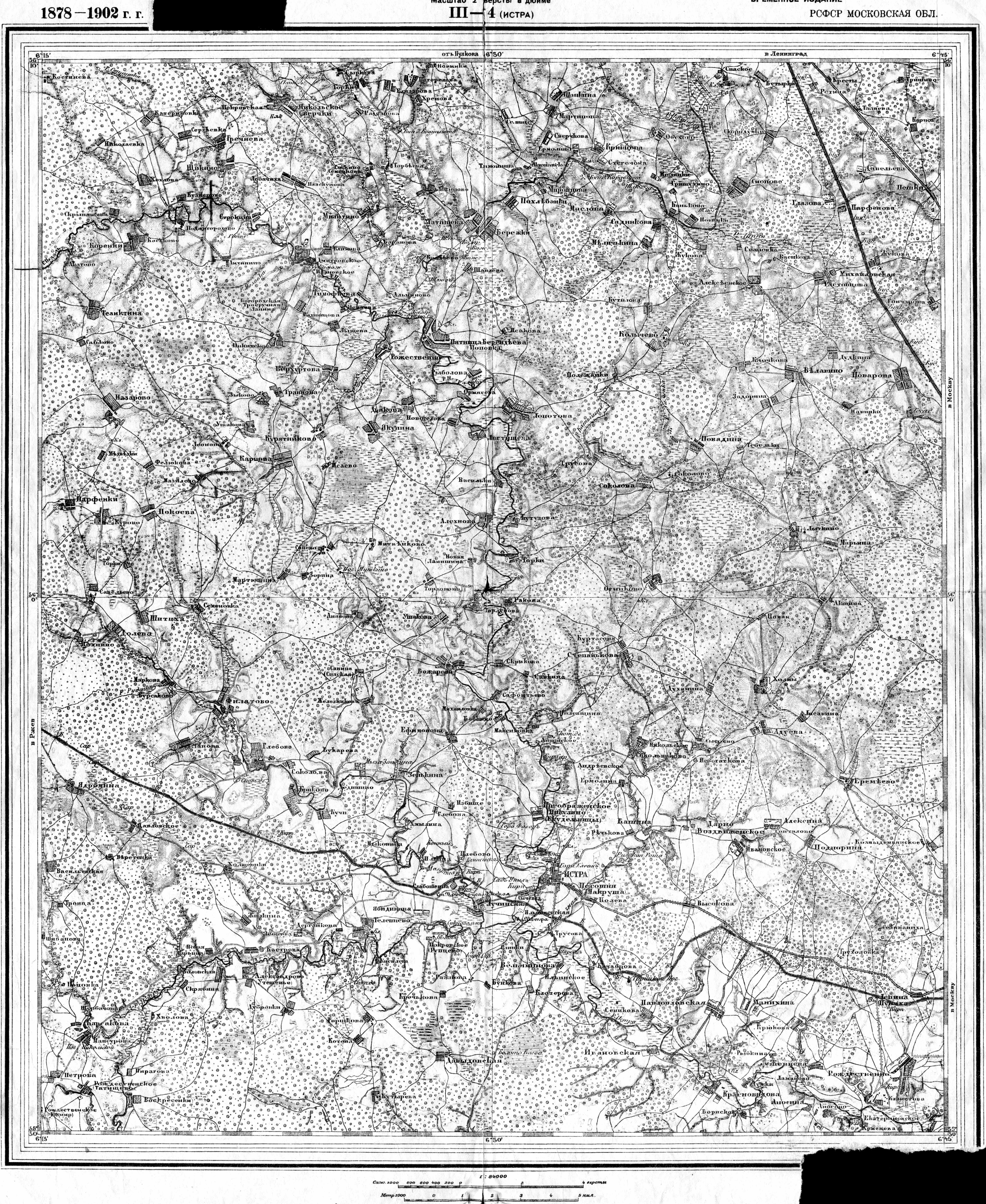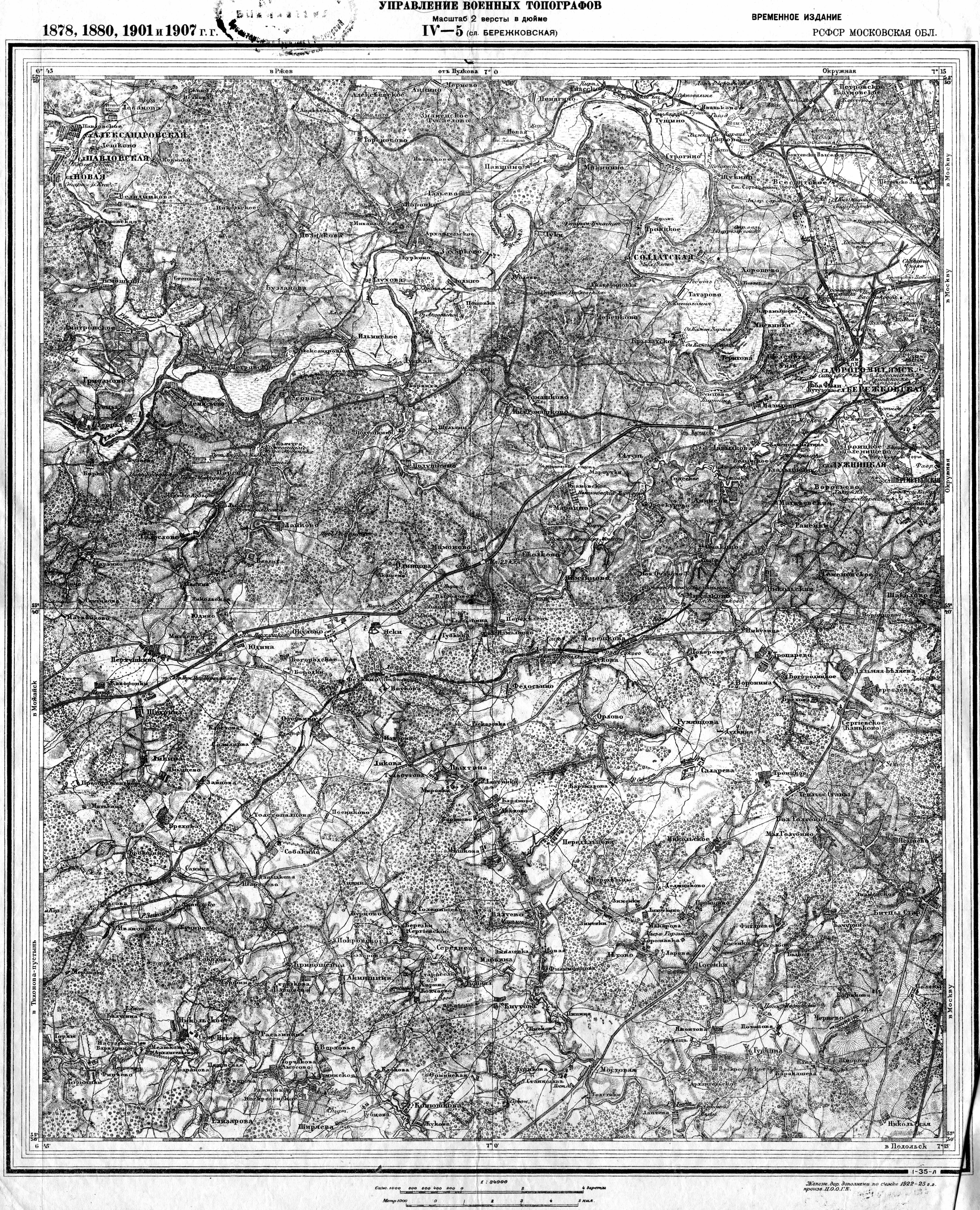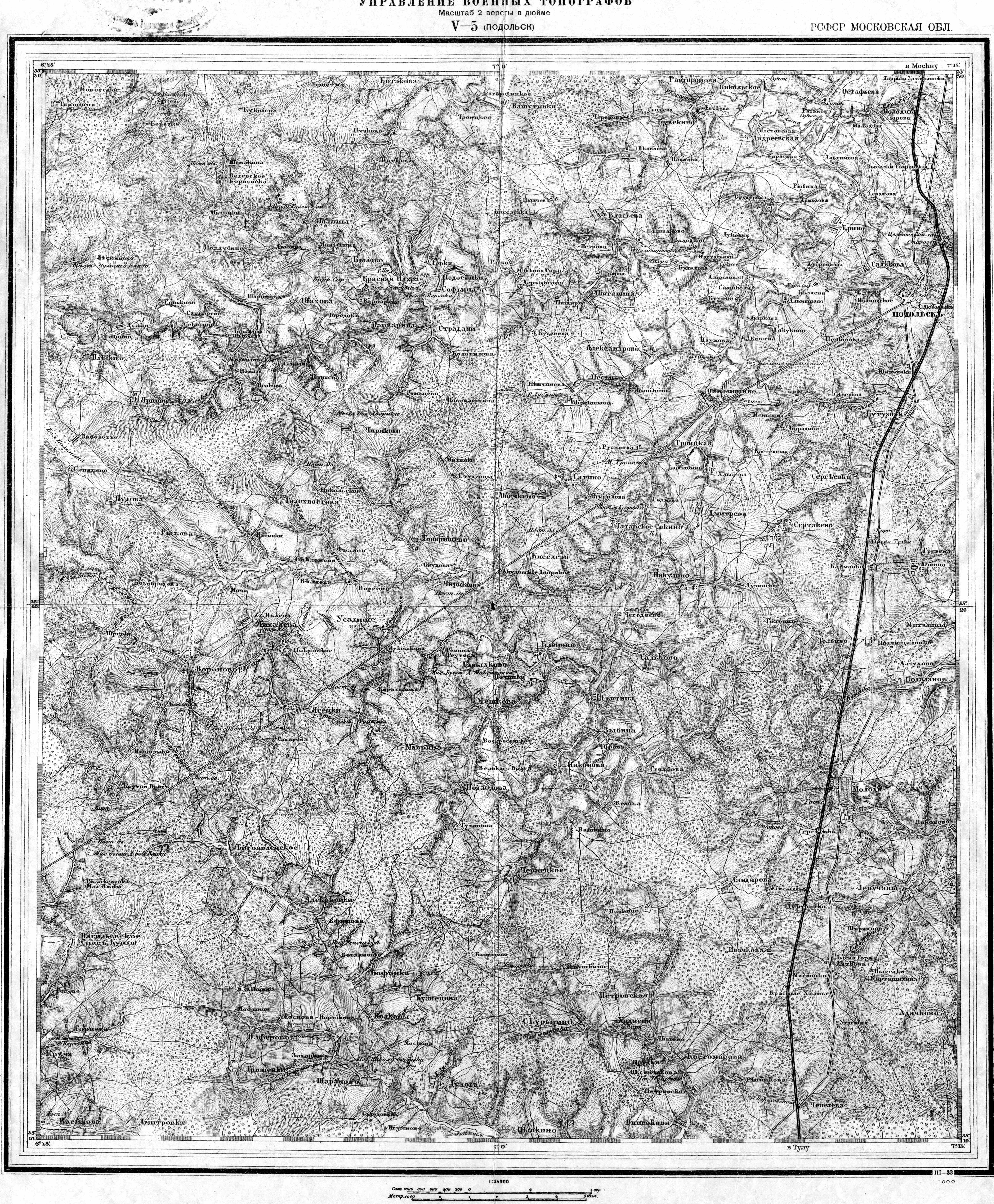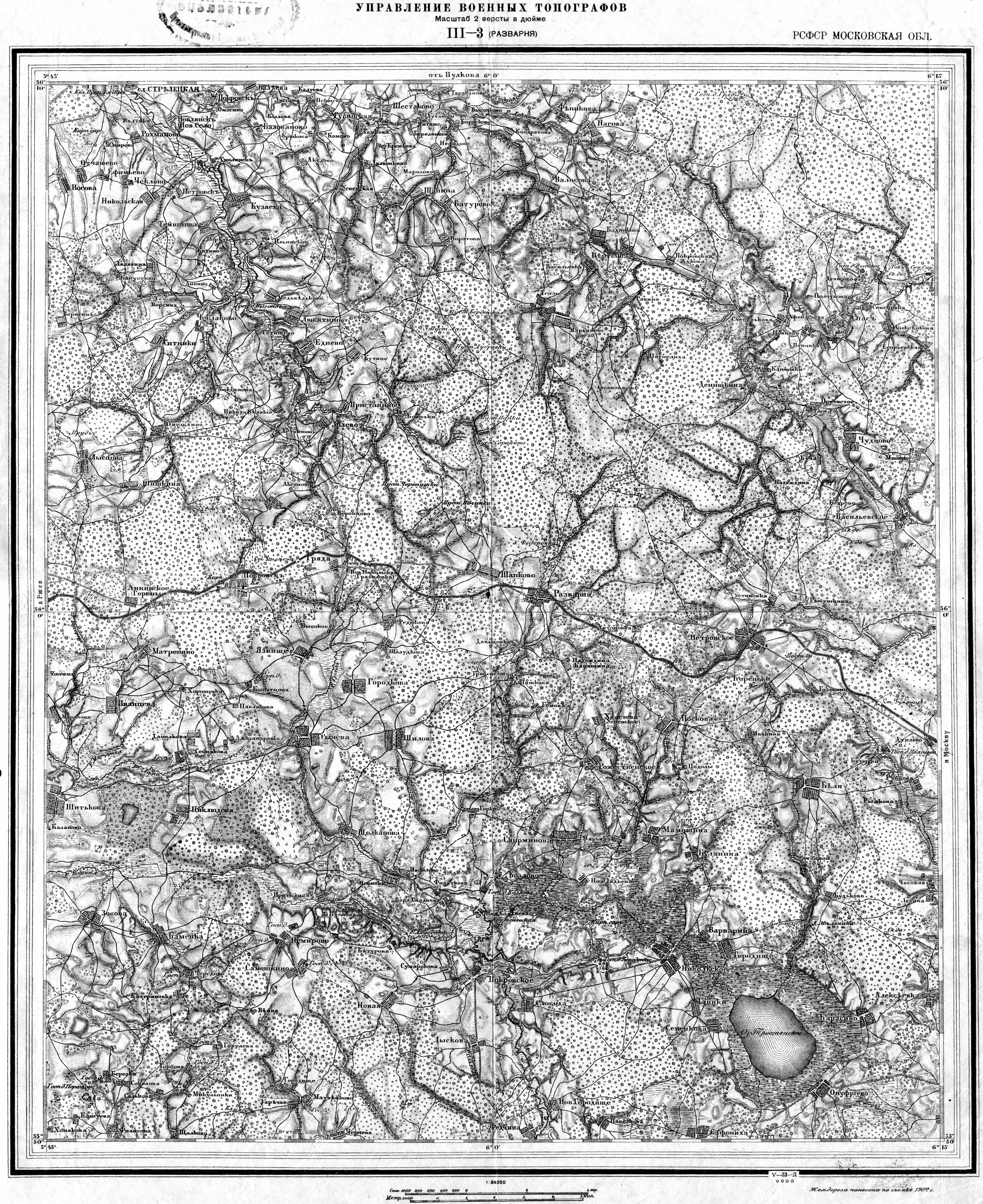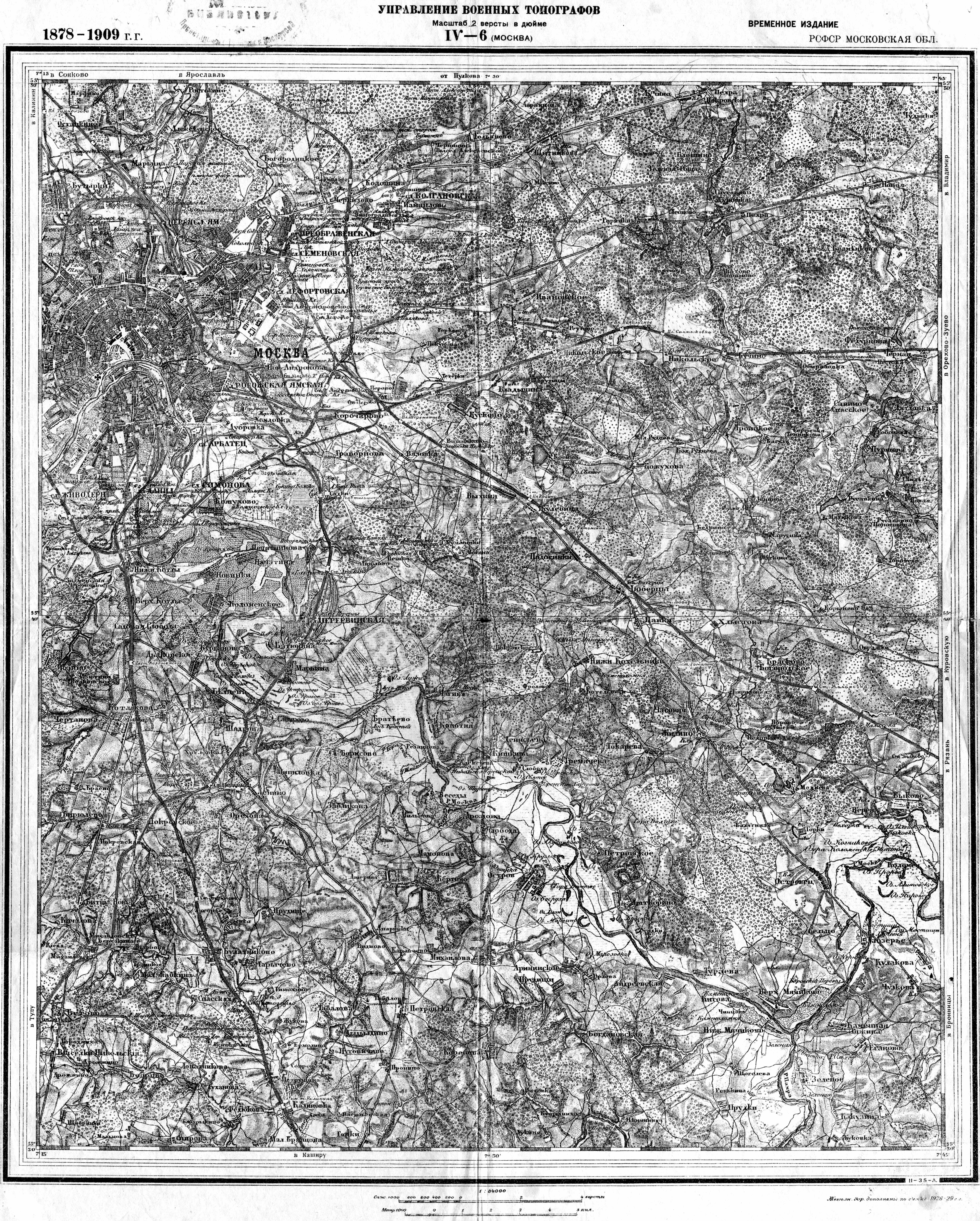 Топографическая карта Московской губернии выполнена в масштабе 1:84 000 или 2 версты в дюйме. В переводе на современную метрическую систему это означает, что в 1 см карты показаны 840 метров местности.