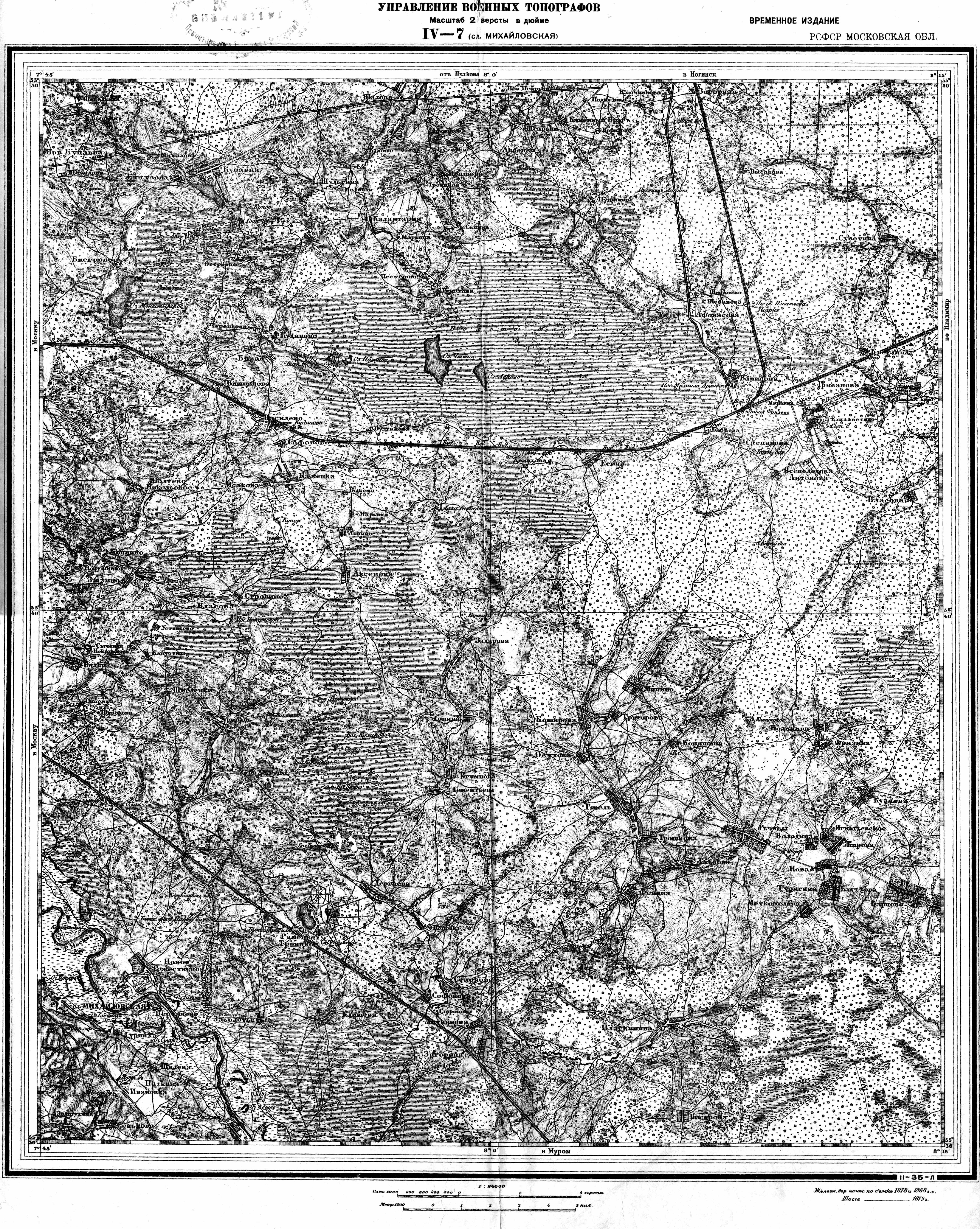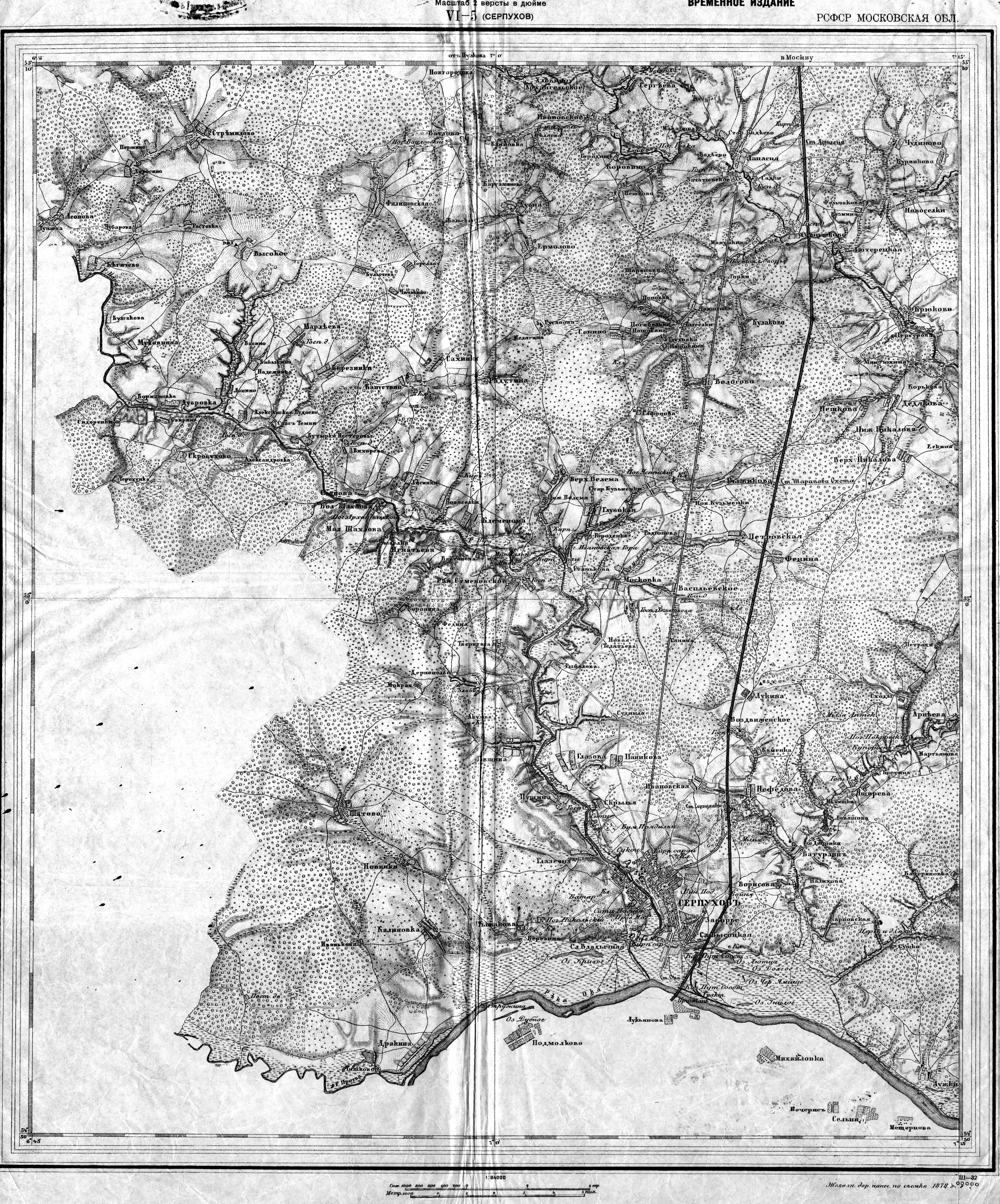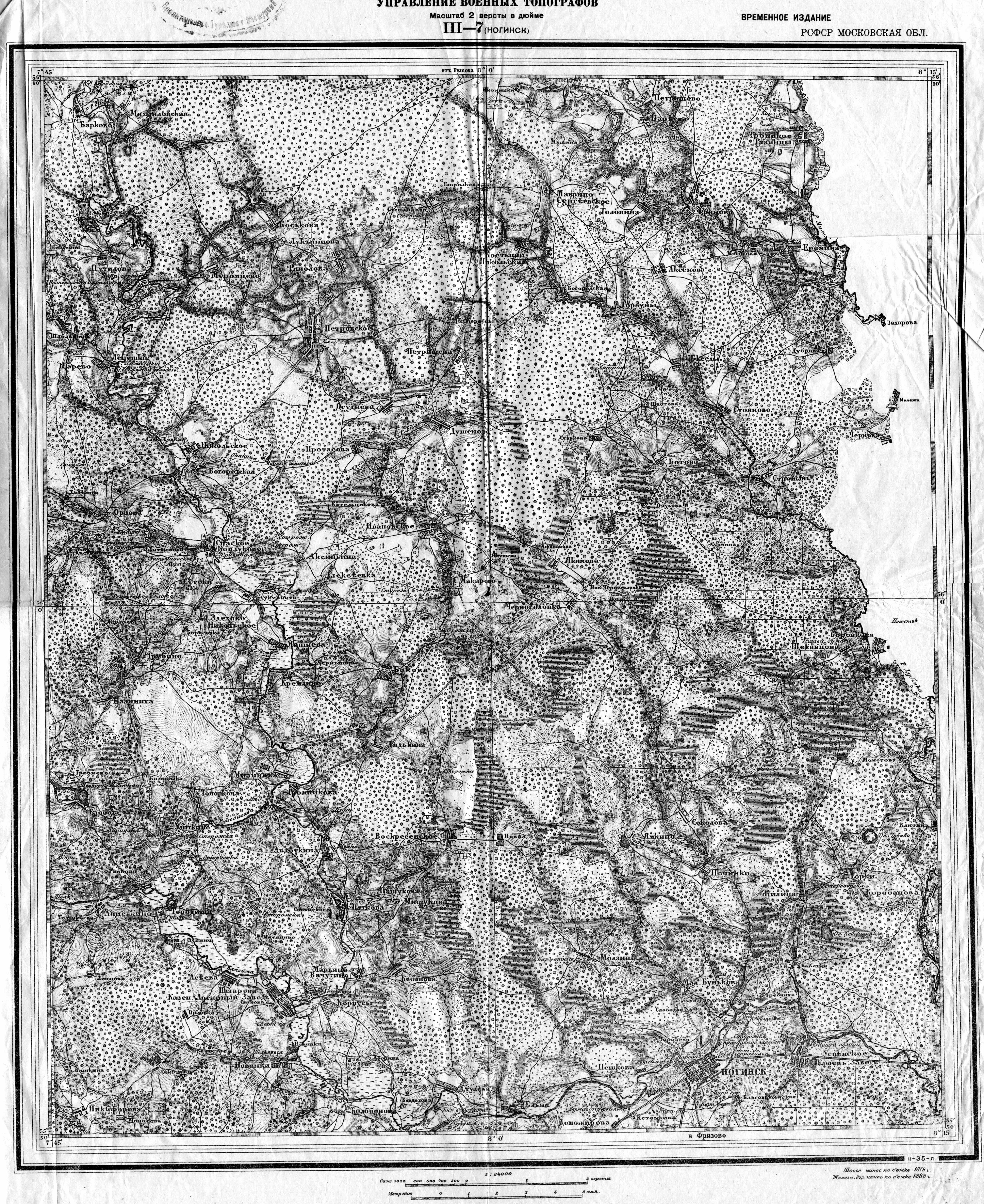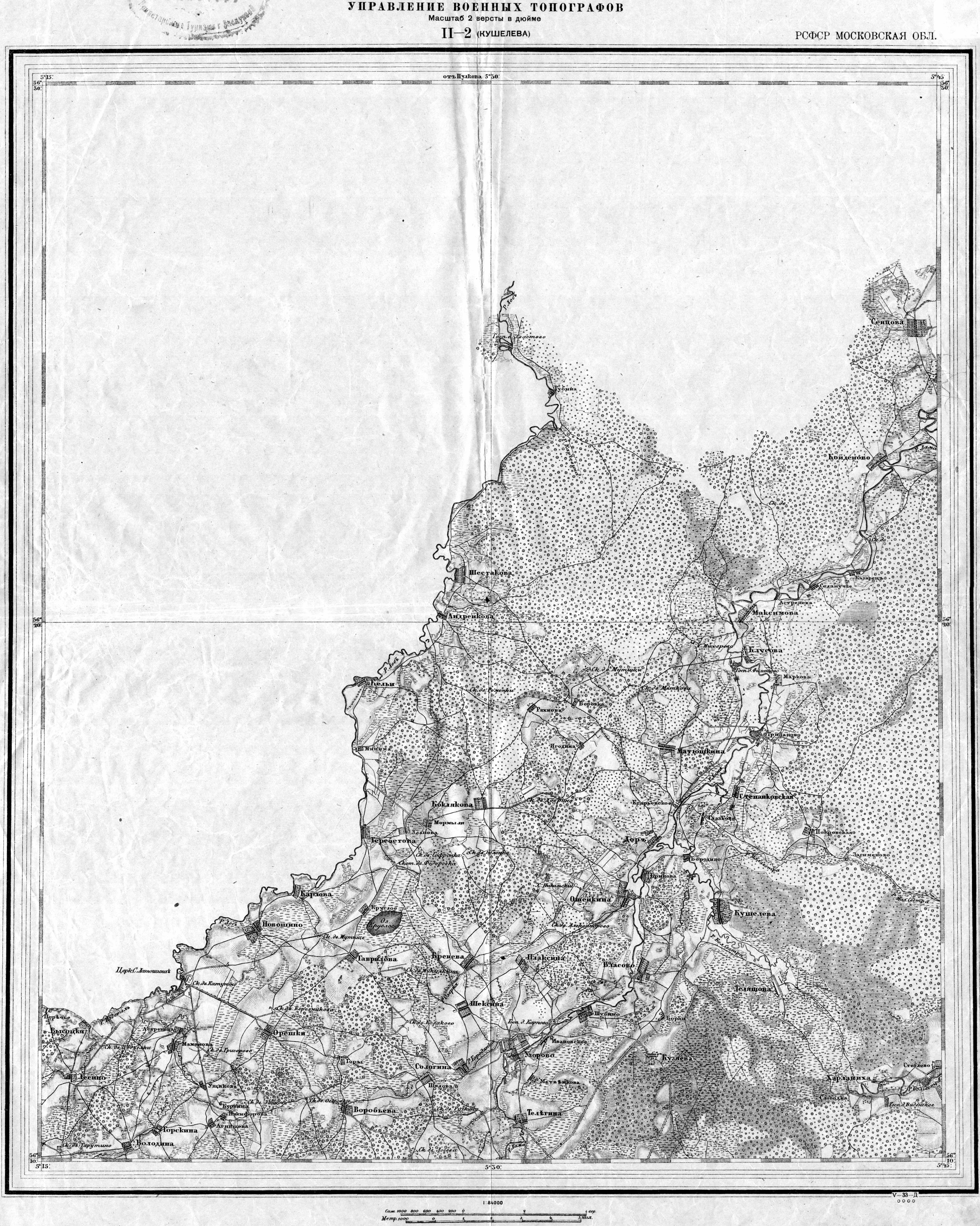 Топографическая карта Московской губернии выполнена в масштабе 1:84 000 или 2 версты в дюйме. В переводе на современную метрическую систему это означает, что в 1 см карты показаны 840 метров местности.