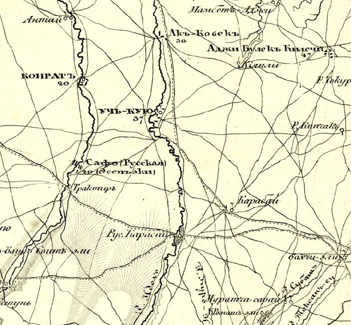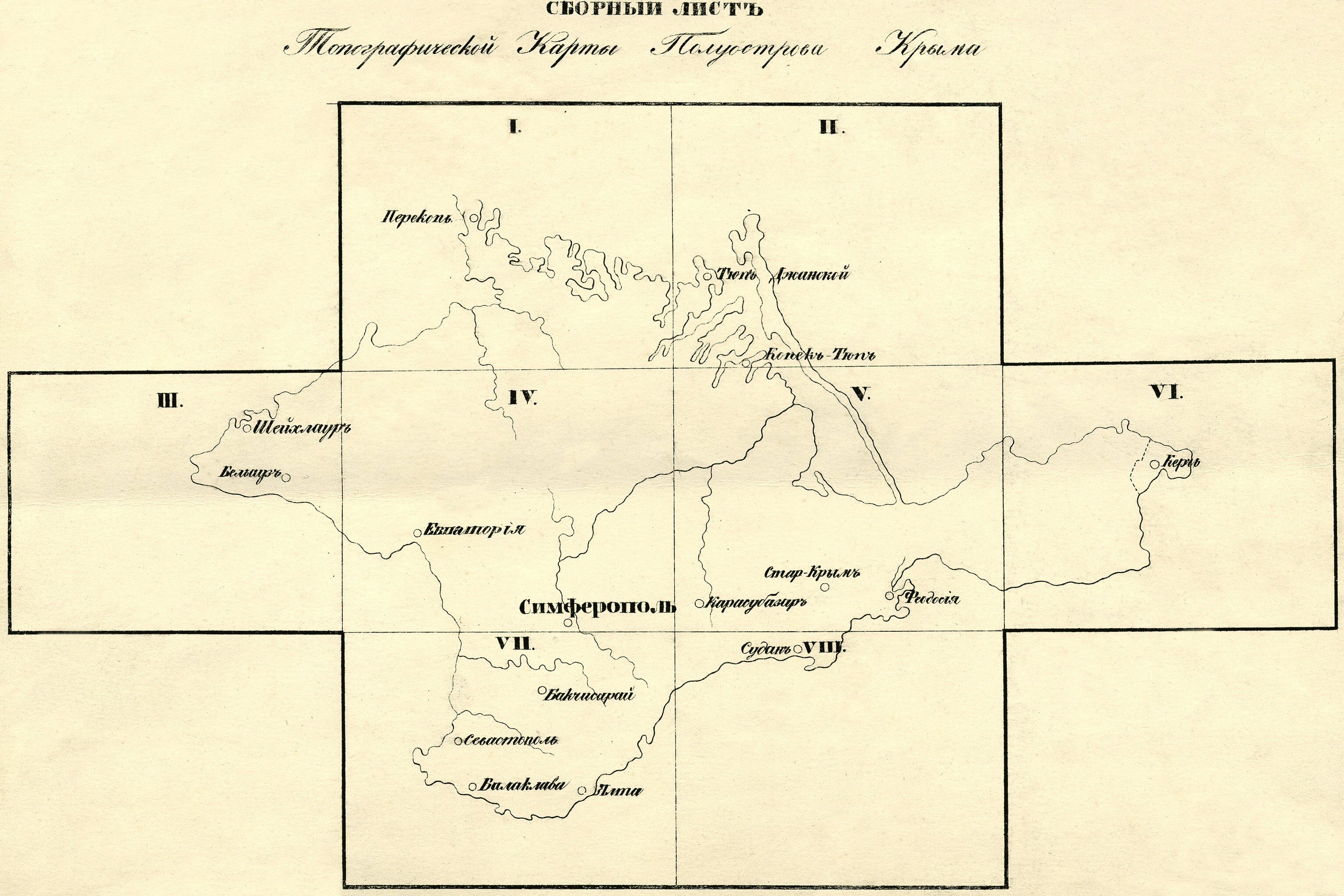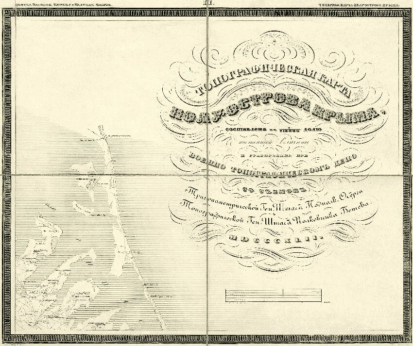 «Топографическая карта полуострова Крыма составлена в 1/210000 долю настоящей величины и гравирована при Военно-топографическом Депо со съемок тригонометрической Ген. Штаба Подполк. Оберга и топографической Ген. Штаба Полковника Бетева».