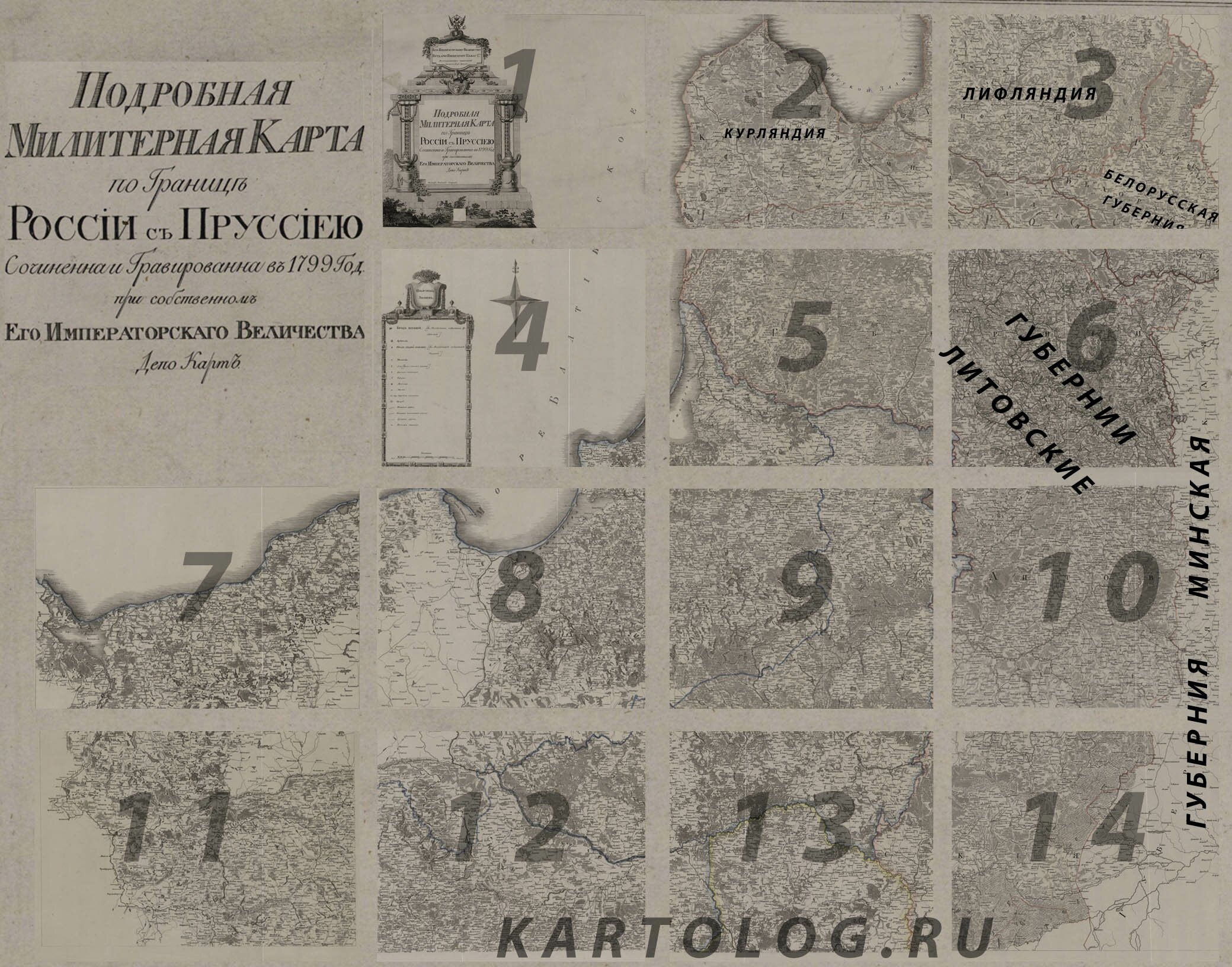 Подробная милитерная карта по границе России с Пруссиею сочинена и гравирована в 1799 году при собственном Его Императорского Величества Депо Карт. Карта состоит из 14 листов. Листы карты гравированы, раскрашены. Размер листов 35х40 (43х55).