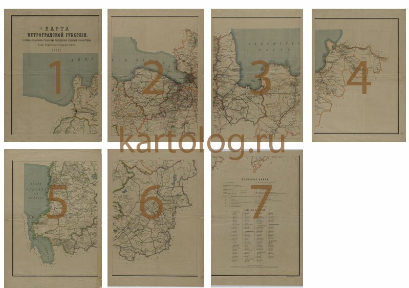 Карта издана на 7 листах, один из которых содержит условные обозначения и список волостей по уездам. Все листы объединены общей рамкой.