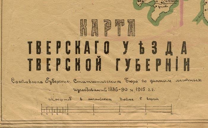 Карты уездов Тверской губернии составлены Губернским статистическим бюро по данным исследований 1886-90 и 1915 гг. Точная дата составления карт не известна. Карты уездов Тверской губернии составлены в масштабе 5 верст в дюйме. На картах нанесены: поселки (с указанием численности, проживающего населения), сторожки, усадьбы, хутора, села и погосты, фабрики, заводы, мельницы и прочие объекты. На картах показаны границы: губернские, уездные и волостные.