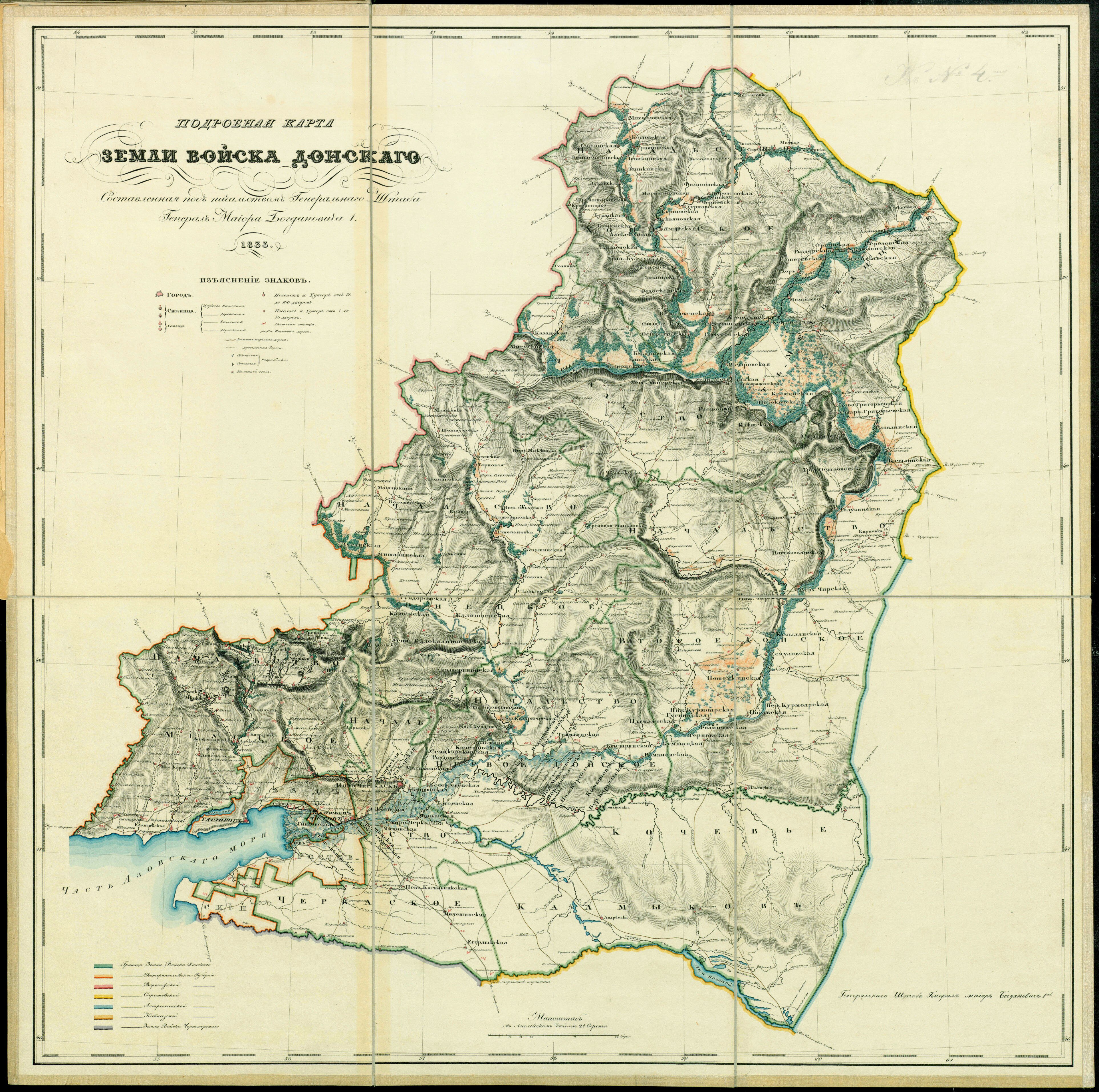 Подробная карта земли Войска Донского составлена под начальством Генерального штаба Генерал Майора Богдановича 1 в 1833 году. Карта земли Войска Донского была издана в качестве приложения к военно-статистическому описанию земли Войска Донского.Масштаб карты 24 версты в английском дюйме. На карте с помощью условных знаков обозначены: города, станицы и слобода, поселки и хутора (включая поселки от 1 до 30 дворов), дороги (как проселочные, так и почтовые), почтовые станции, разработки (железные и свинцовые) и прочее.