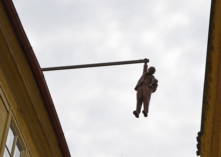 Над тротуарами и крышами домов старой Праги, схватившись одной рукой за перекладину, висит мужчина. Причем, не просто мужчина, а сам Зигмунд Фрейд, принимающий решение – отпустить ли ему руку (вторая в кармане) или продолжать держаться. Стоит заказать памятник такого стиля в свой город. До Праги висящий в воздухе психоаналитик успел повисеть во многих городах мира (Стокгольм, Чикаго и т.д.) и зачастую вызывал панику среди проходивших внизу людей, принимавших его за живого человека и звонивших в службу спасения.