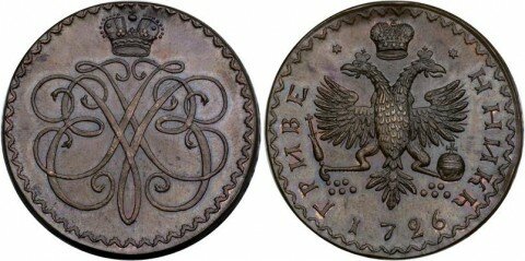 Пробные монеты, как и бракованные заслуживают особого внимания у коллекционеров. Они более ценные, дорогие и, как правило, красивые. В их число входит медная монета первой половины 18-го века – пробный гривенник (1726 года), который ознаменовали как «меншиков гривенник».