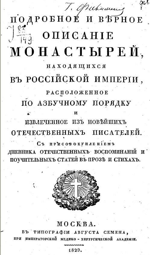 Подробное и верное описание монастырей, находящихся в Российской Империи, 1829 г.