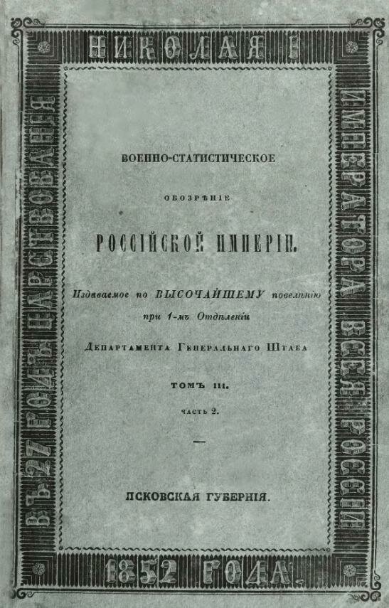 | Название: | Военно-статистическое обозрение Российской Империи. Том III. Часть 2. Псковская губерния. | |